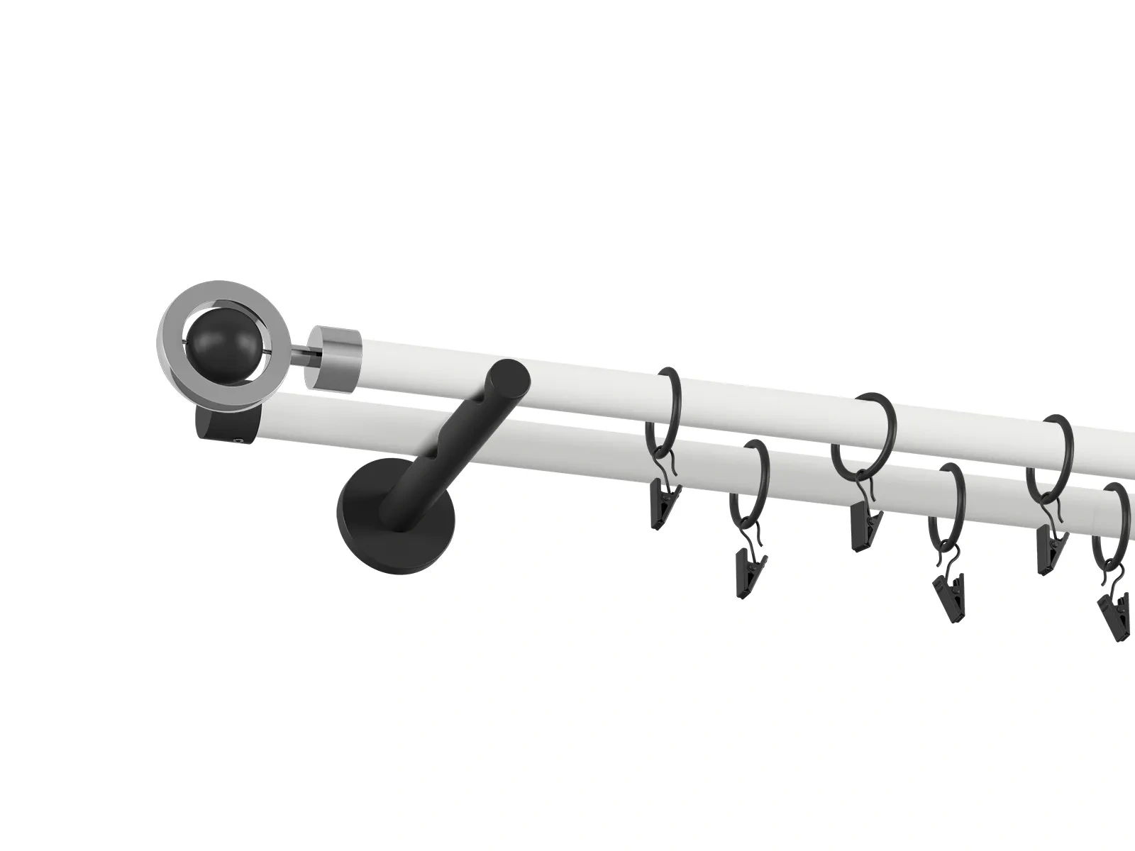 Na výber je viacero typov koncoviek a držiakov, čo umožňuje prispôsobiť garnižu presne podľa štýlu interiéru - od jednoduchých a nenápadných tvarov až po dizajnovejšie ukončenia, ktoré môžu slúžiť aj ako dekoratívny prvok. Pri prevedení bielo čiernej tyče je tyč biela a koncovky, držiaky a štipce s krúžkami čierne. Veľkou výhodou obyčajnej tyče je jej univerzálnosť. Ak máte závesy, v ktorých sú už našité kovové alebo textilné očká (krúžky), nie je potrebné dokupovať krúžky so štipcami. Záves stačí jednoducho nasunúť priamo na tyč, čo šetrí čas aj náklady a zároveň zabezpečuje čistý vzhľad.