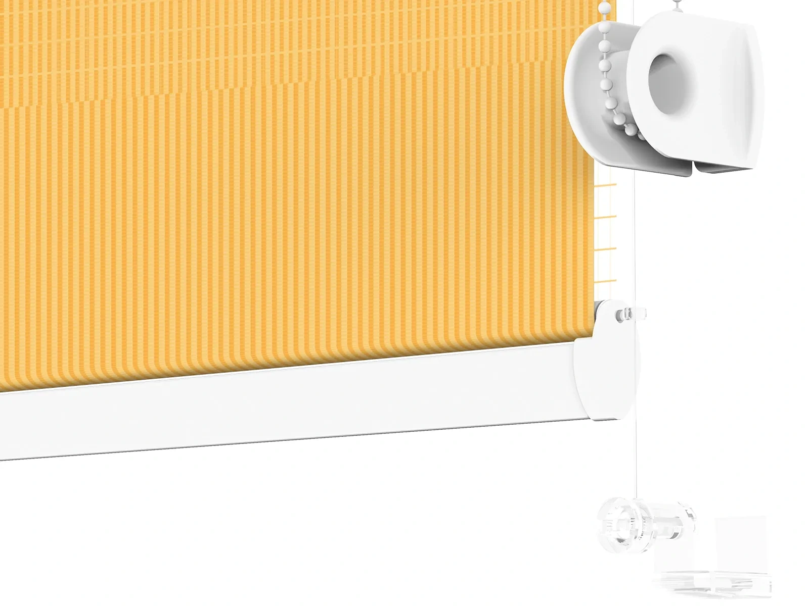 d. Ak ste si zvolili vedenie roletky za pomoci silónu (voliteľné), prevlečte silón cez očko na konci závažia látky. Taktiež prevlečte silón cez napínací mechanizmus a za napínacím mechanizmom uviažte uzlík.