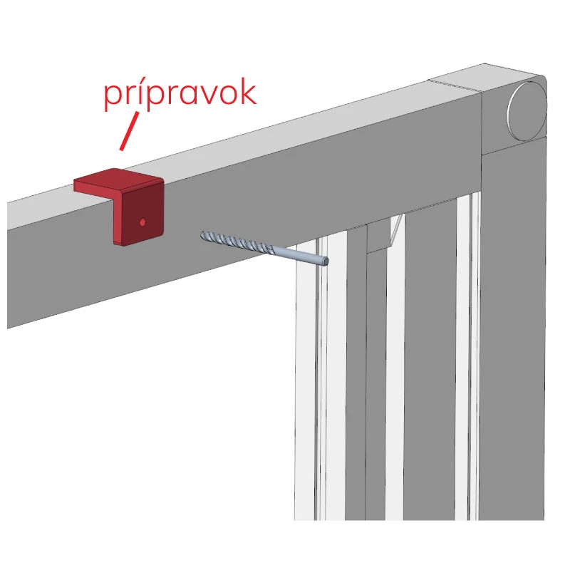 • Na určených pozíciach si predvŕtajte otvory 2,5 mm cez obe steny profilu pre upínacie skrutky pomocou PRIPRAVKU (kt. je súčasťou balenia). PRÍPRAVOK urči správnu vzdialenosť od okraja profilu.